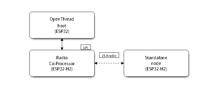 在此模式下,芯片通过连接到运行 OpenThread IP 协议栈的另一个主机,代表主机发送和接收 15.4 数据包。该模式适用于支持 15.4 无线通信协议的芯片,如 ESP32-H2, ESP32-C6。对于芯片和主机之间的通信方式,目前 ESP-IDF 支持 SPI 或 UART。考虑到传输延迟,建议使用 SPI。
